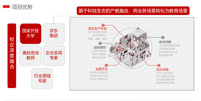 为深入贯彻落实《国务院办公厅关于深化产教融合的若干意见》(国办发〔2017〕95号)、《国务院办公厅关于印发职业技能提升行动方案(2019—2021年)的通知》(国办发〔2019〕24号)及《关于印发国家产教融合建设试点实施方案的通知》(发改社会〔2019〕1558号)等文件精神,充分发挥国家开放大学在构建服务全民终身学习教育体系中的重要作用,全面推进国家开放大学社会培训发展壮大战略,国家开放大学与京东集团共建“国家开放大学京东培训学院”(以下简称“学院”),积极探索校企联合开展应用性人才培训新模式。