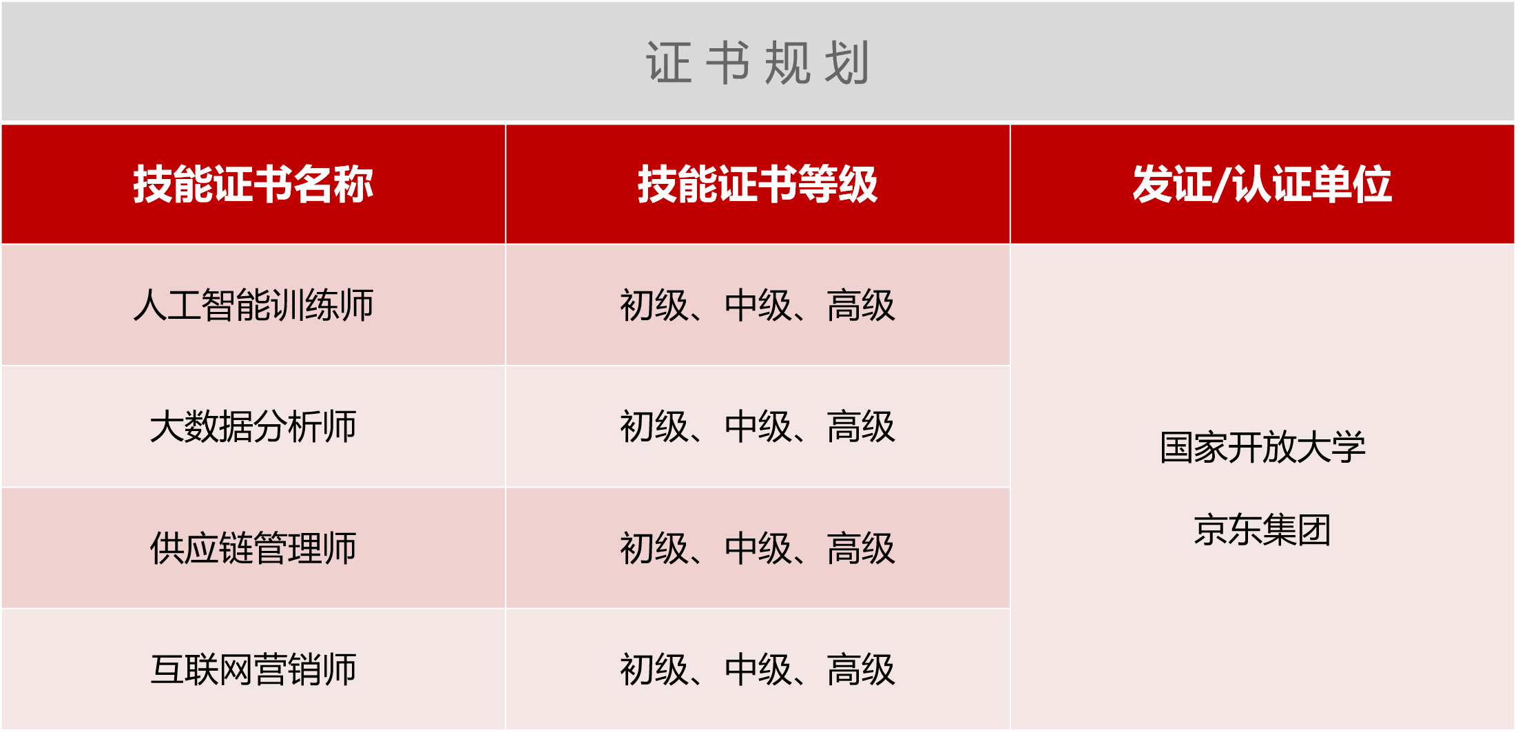 【企业实战平台、领先行业标准】有效整合京东集团“大数据智能管理与分析技术国家地方联合工程研究中心”、“国家人工智能开放创新平台”等优势,以持续创新培训模式,推进落实针对人工智能训练师、大数据分析师、供应链管理师、互联网营销师等信息技术领域岗位人才评价标准,有效提升职业技能、职业素养等核心竞争力。