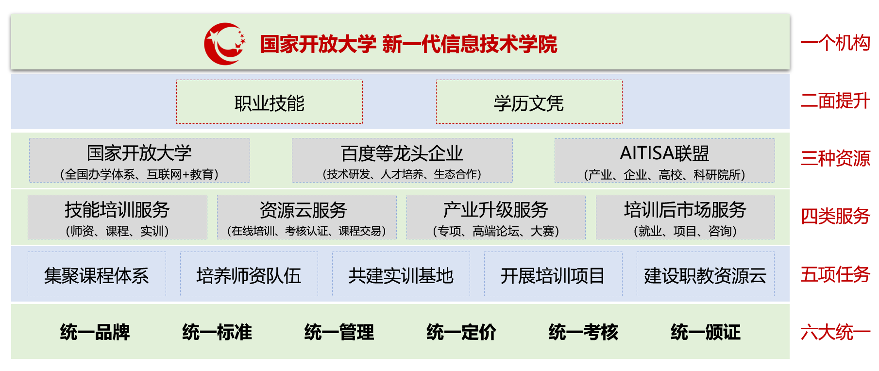 国家开放大学新一代信息技术学院按照“123456”总体思路开展工作,即充分依托“3种资源”,实现“2面提升”,保证新一代信息技术学院“1个机构”健康发展并不断壮大。学院严格按照“6大统一”的原则,通过开展“5项工作”,逐步落地实现并提供“4类服务”,全面打通师资培养、技能培训、成果认证、成果积累、就业推荐等终身教育全过程,把国家开放大学建设成为我国“新一代信息技术”领域社会教育培训的重要平台、重要渠道和国家品牌。